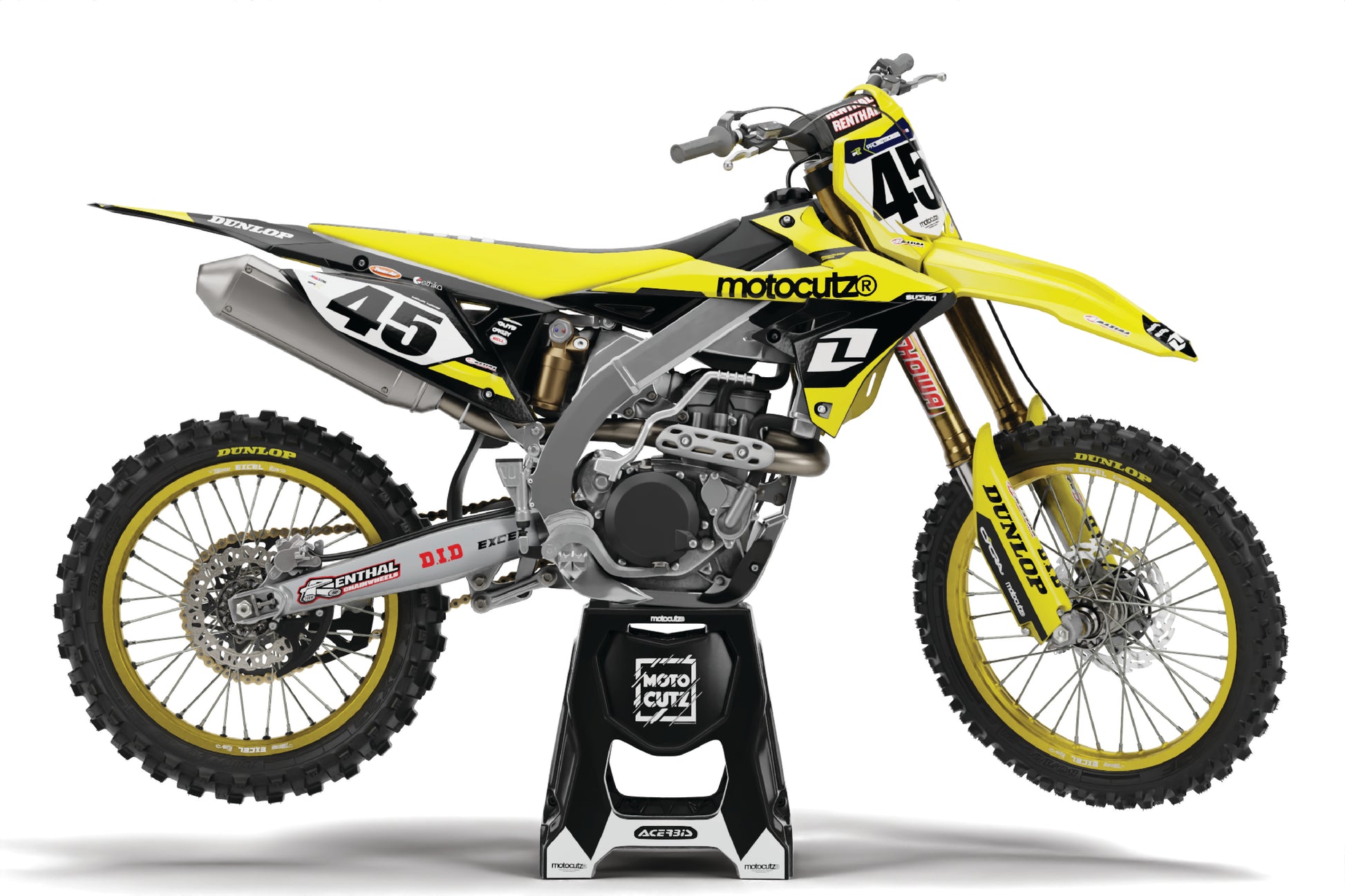 Radiator Shroud Graphics, Front & Side Number Plates, Air Box Graphics, Front & Rear Fender Graphics, Fork Guard Graphics, and Swing Arm Graphics.